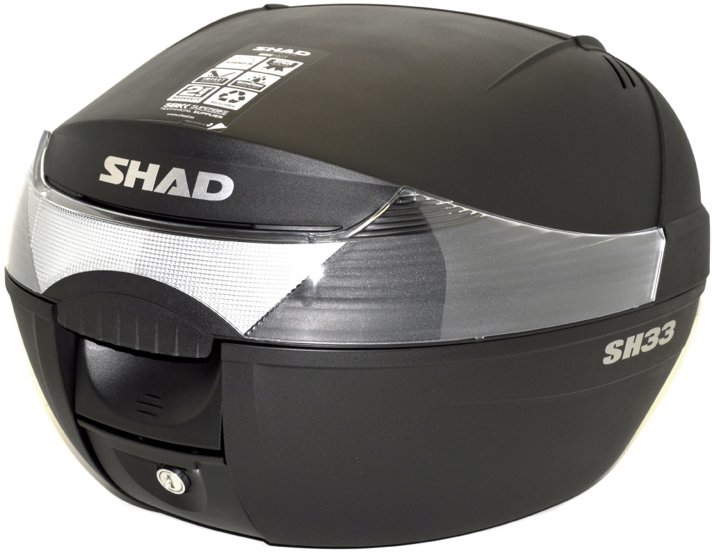 Vrchní kufr SH33 je kompaktní a velmi praktický vrchní kufr vyrobený z vysoce kvalitního tvrzeného polypropylenu, schopný pojmout vyklápěcí helmu a rukavice. Jedná se o základní model řady vrchních kufrů SHAD se zaobleným tvarem a kouřovou odrazkou. Svou velikostí je vhodný pro skútry a menší motorky s nižším objemem.