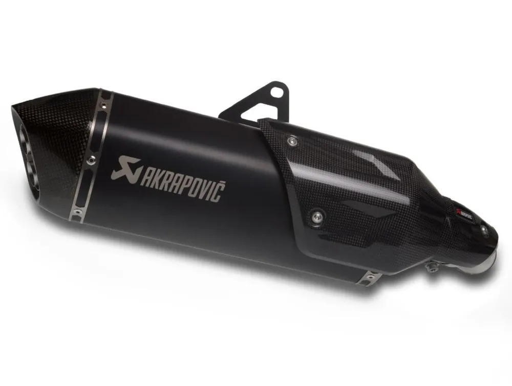 Sportovní výfuk Akrapovič vyrobený z titanu v krásné hluboké černé barvě a vypáleným logem výrobce.