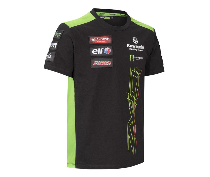 Stylové pánské tričko s krátkými rukávy a kulatým výstřihem vyvedené v originálních týmových barvách a grafice Kawasaki Racing Team WSBK
